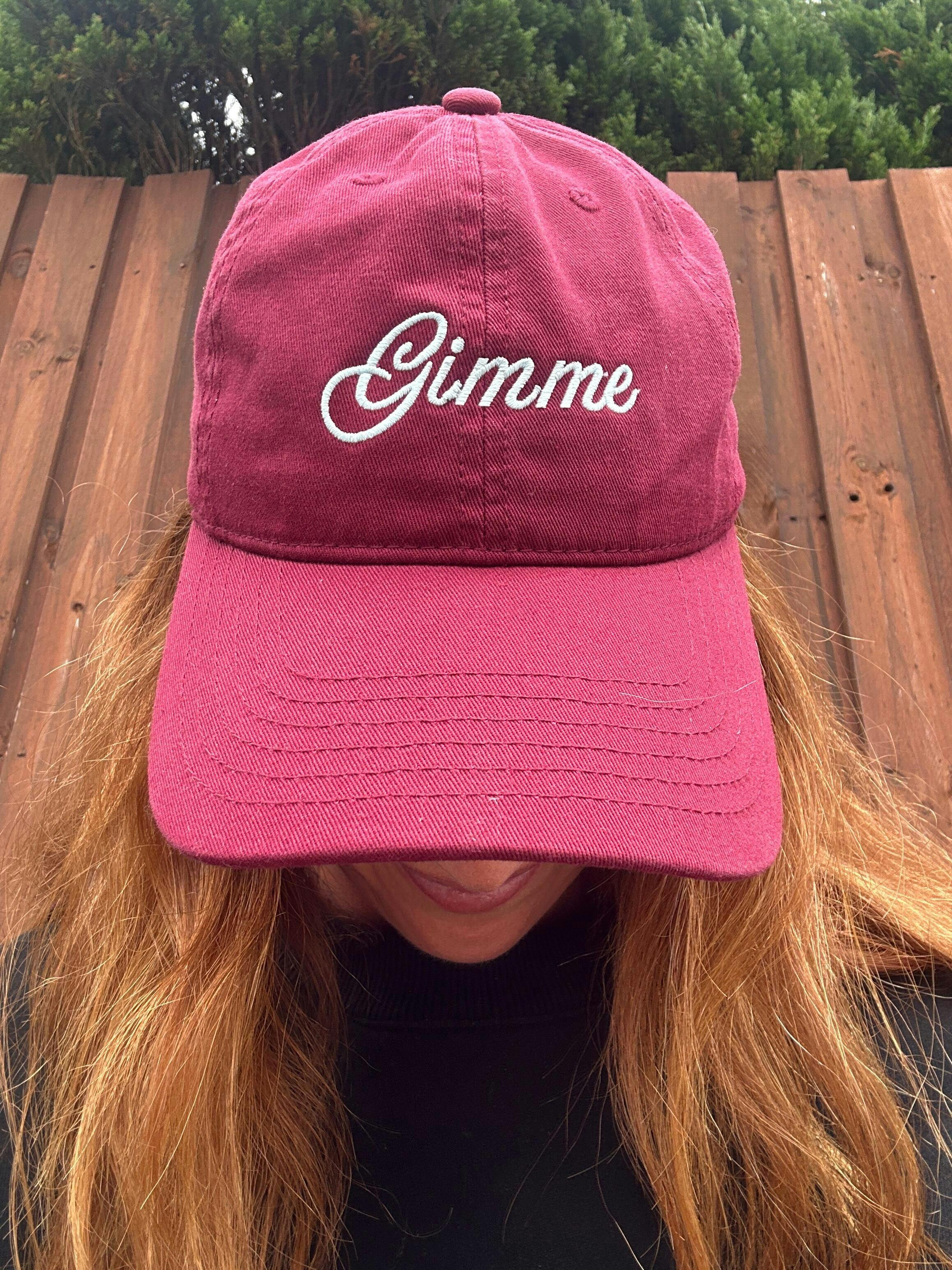 This classic soft dad cap is a gorgeous cherry red with 'Gimme' embroidered in light blue.