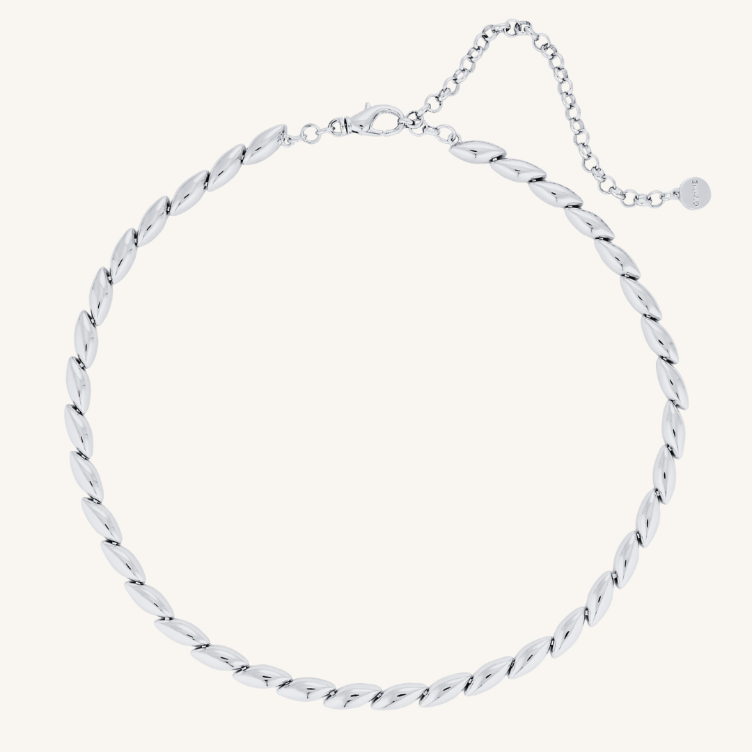 The Small Marquise Necklace in Silver brings a sleek, modern edge to a timeless silhouette. Its polished marquise-shaped links sit elegantly against the neckline, offering a versatile piece that can be styled for both day and night.