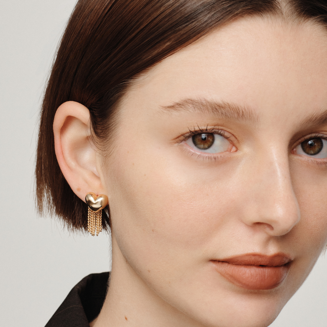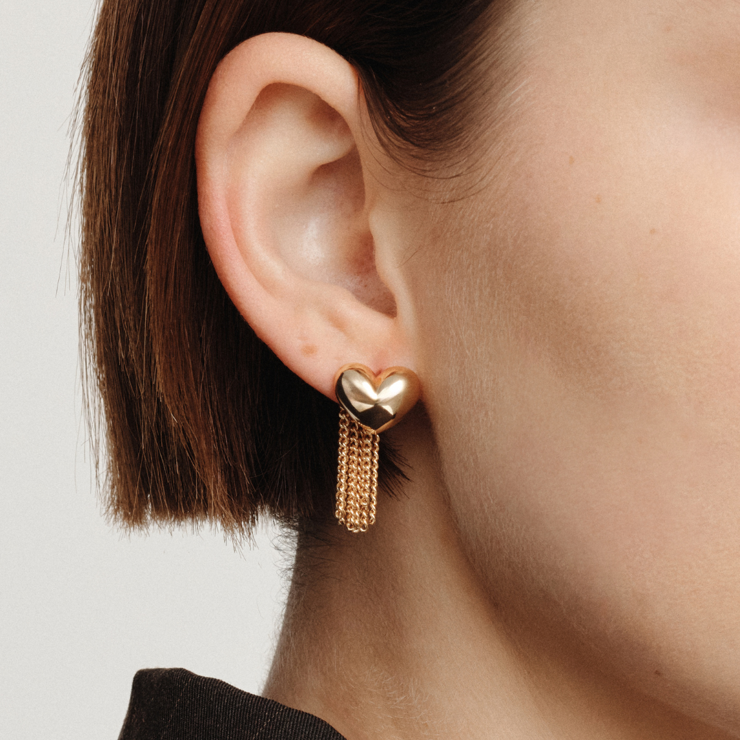 A 2-in-1 statement earring featuring puffed hearts and detachable chain fringe. Wear them bold or pared back, Paris brings drama when you want it, and subtle sparkle when you don’t.
