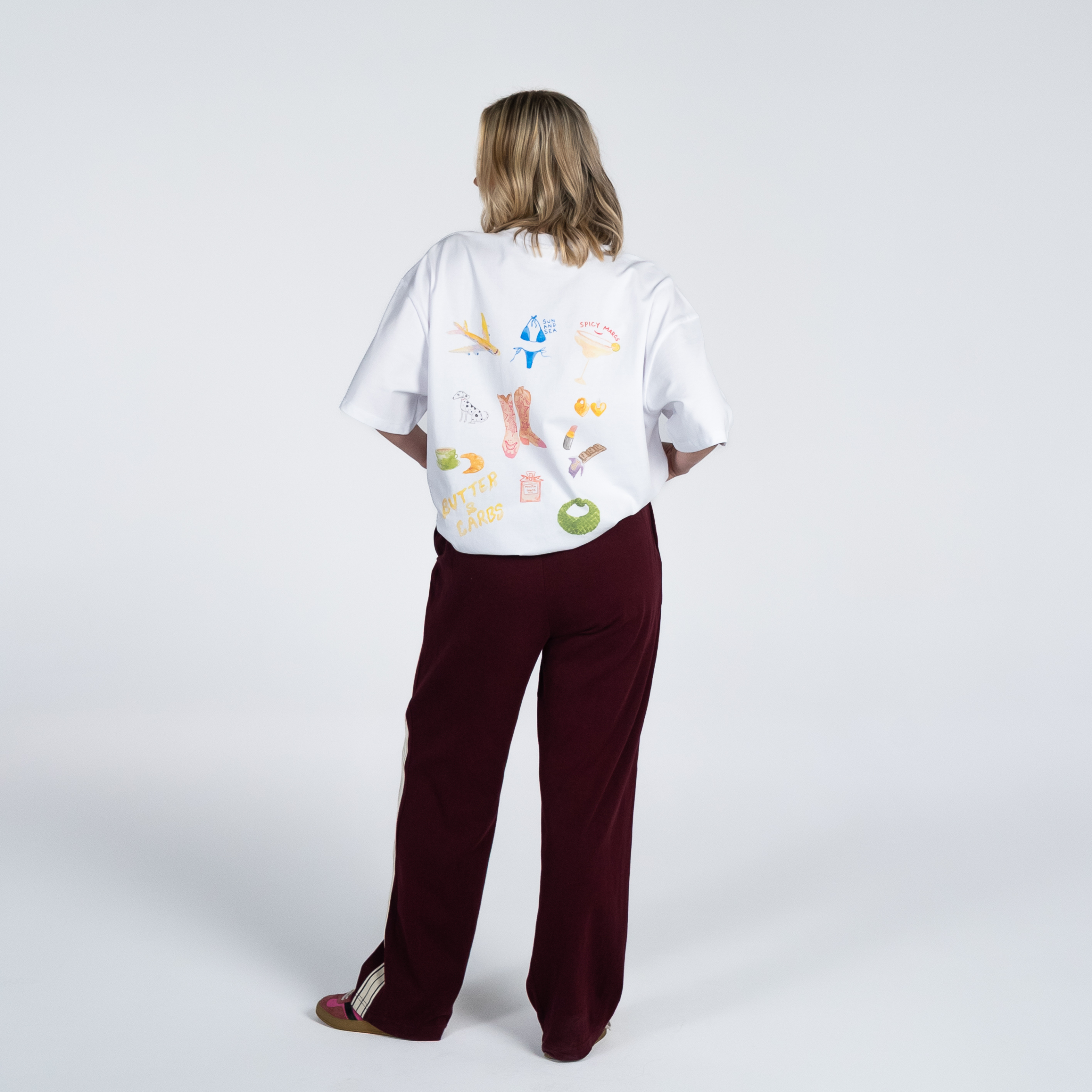 The tee pairs perfectly with tailored trousers, jeans, denim cut-offs, a lace skirt, or cute, colourful trackies.