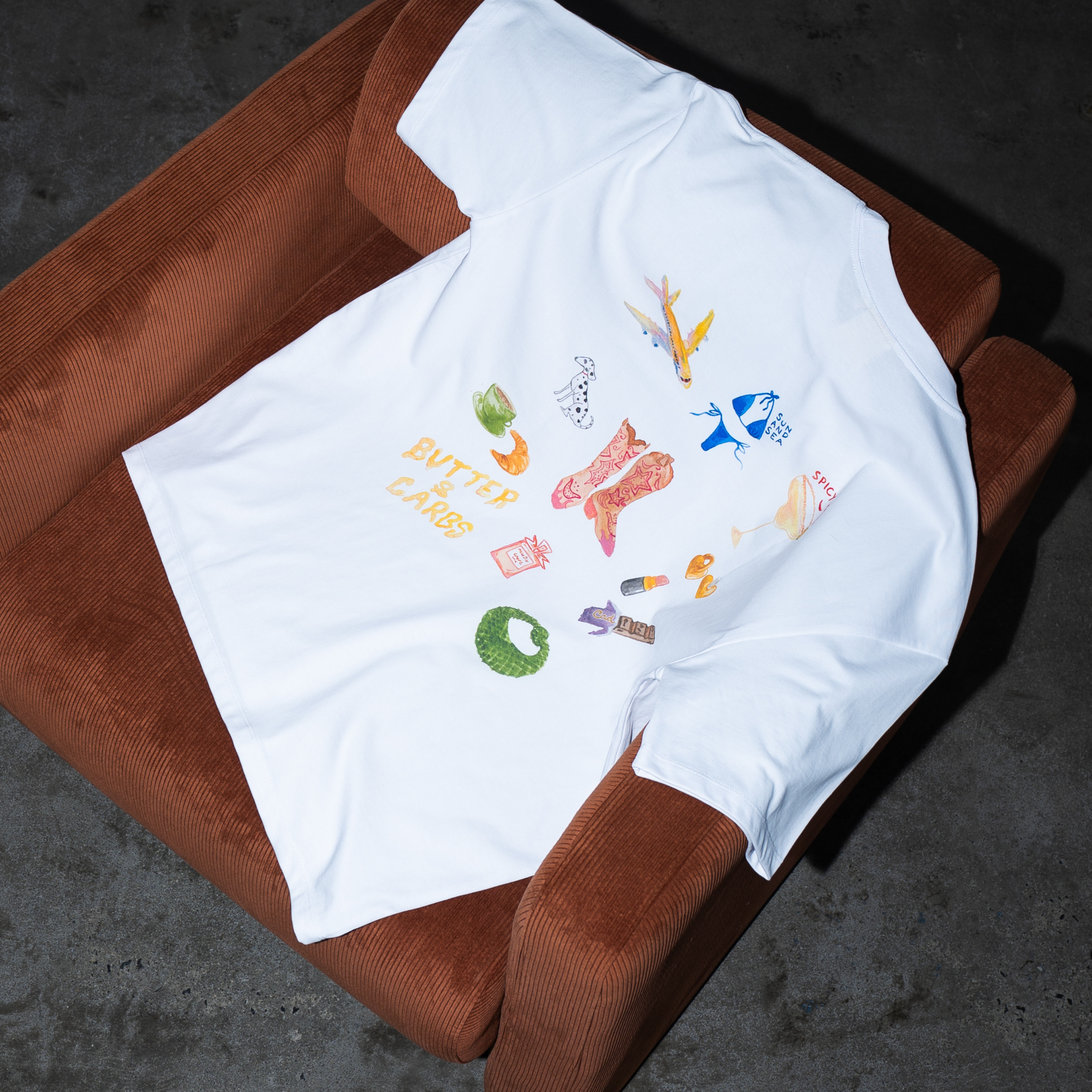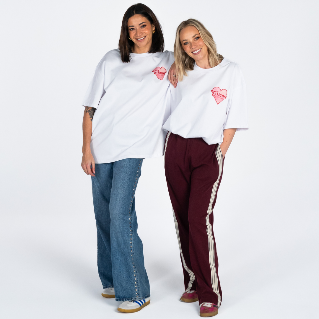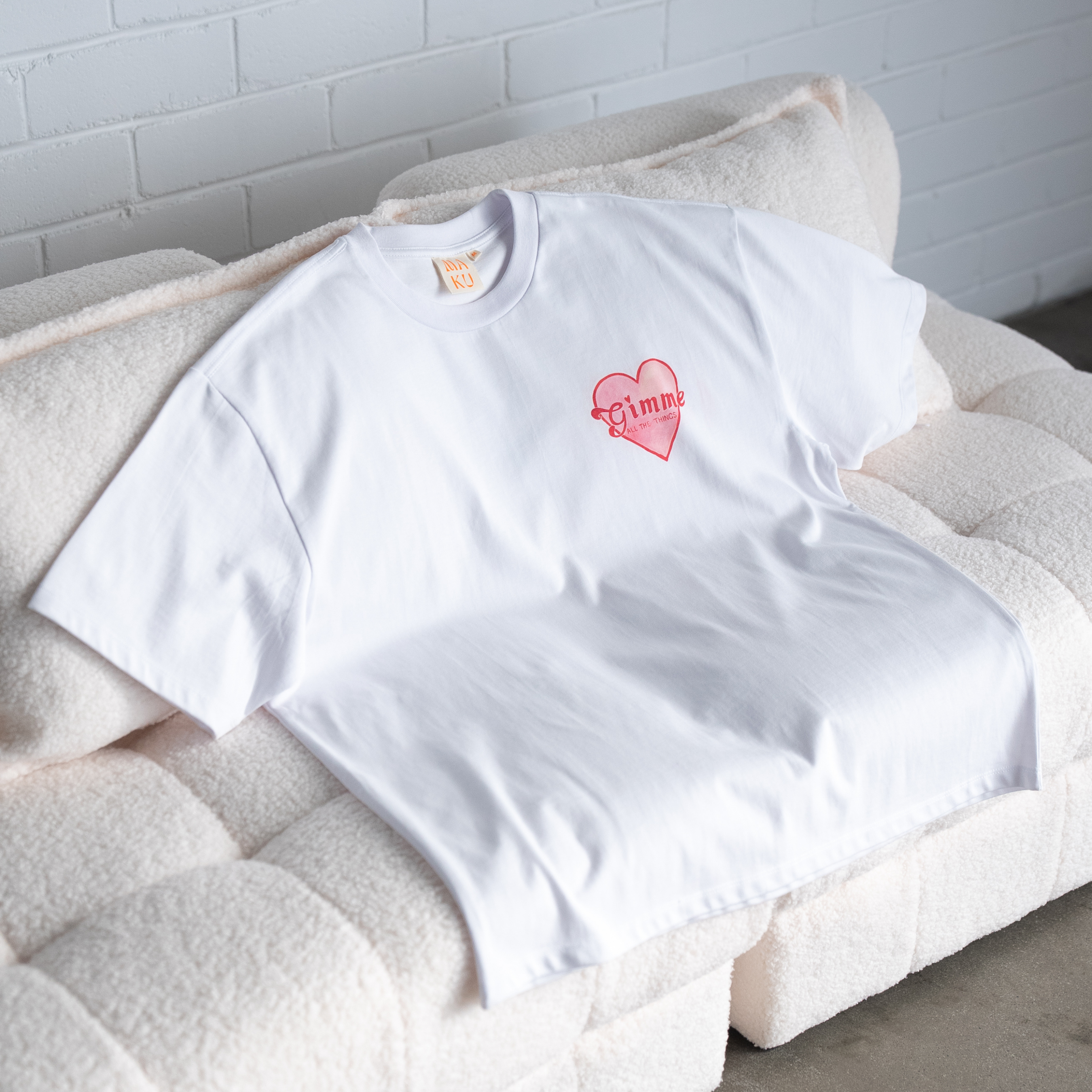 This limited edition collab tee with artist Maku is a love letter to life’s guilty pleasures; the spicy marg, the perfect croissant, the last-minute getaway. On the front, a custom emblem spelling out Gimme All The Things. On the back? A gallery of Maku’s playful hand-drawn icons; perfume, cowboy boots, coffee, our iconic Lisa Puffy Heart Earrings and more.